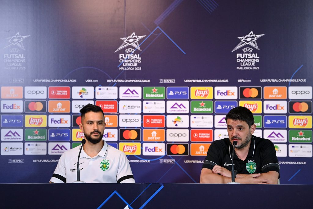 PALMA DE MALLORCA, SPAIN – MAY 6: Sporting Club de Portugal’s João Matos, left, and head coach Nuno Dias during a Sporting Clube de Portugal press conference ahead of UEFA Futsal Champions League Final 2022/23 at the Velòdrom Illes Balears on 6 May 2023 in Palma de Mallorca, Spain. (Photo by Seb Daly – Sportsfile/UEFA via Getty Images)
